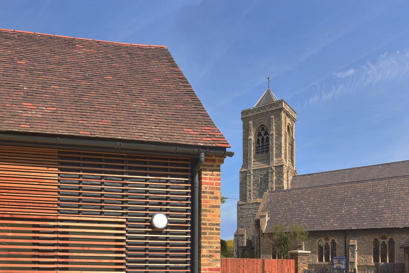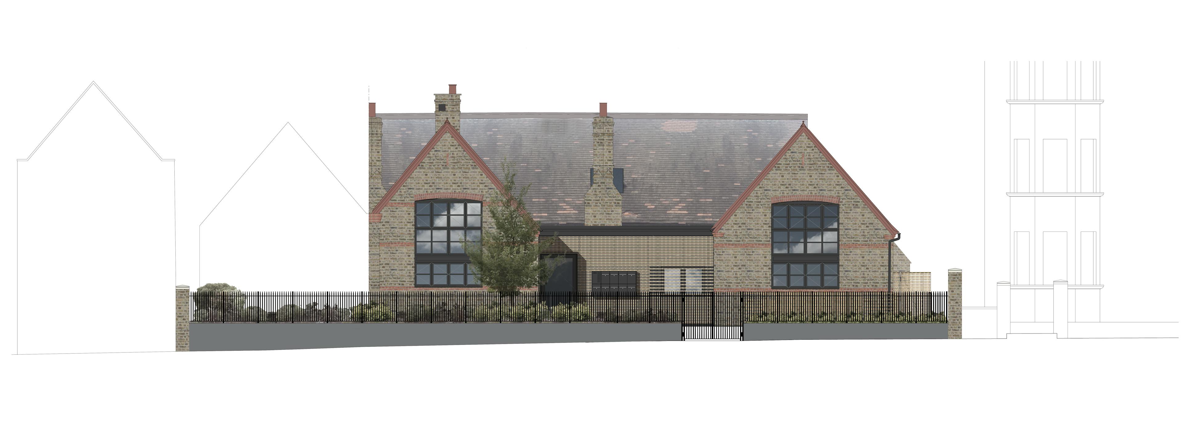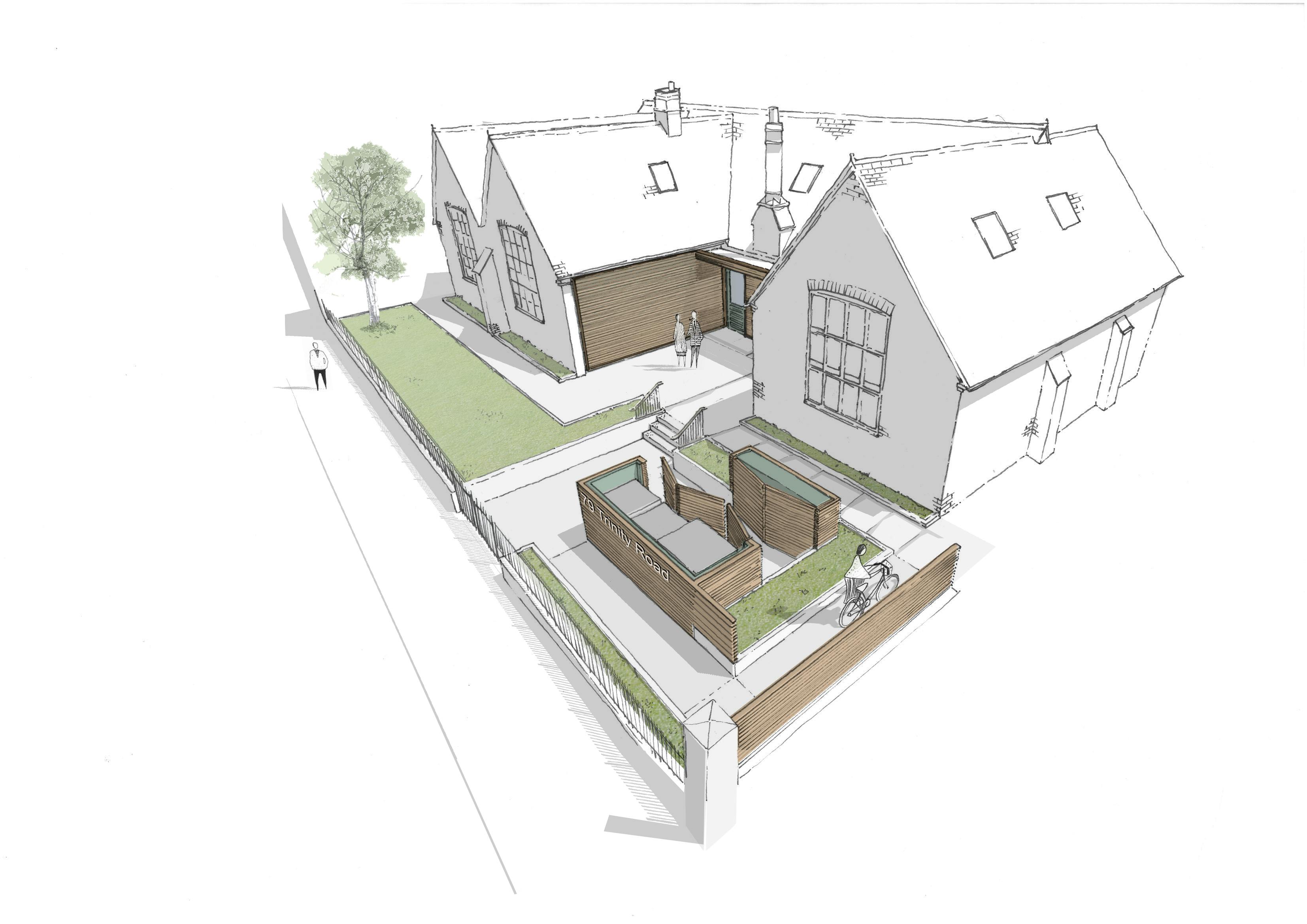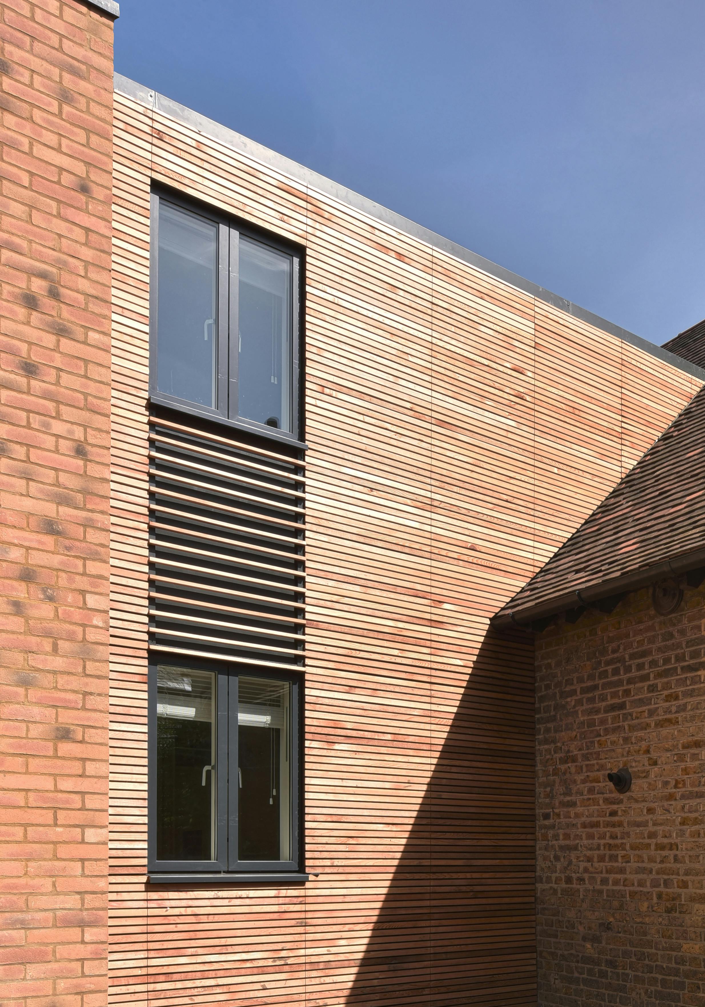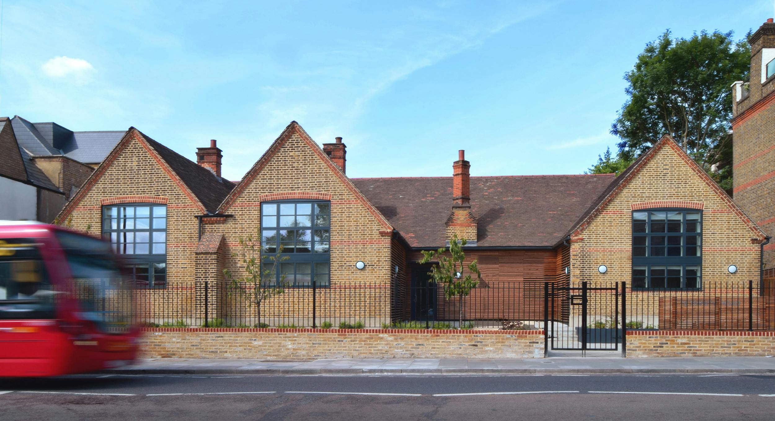 A change of use to residential made the redevelopment of the site financially viable. Located adjacent to a conservation area and opposite a grade II listed church, the existing school required sensitive refurbishment. A single-storey toilet extension at the front was demolished to create a new entrance courtyard, and playful timber slatting was used to conceal damaged walls and to link old and new.