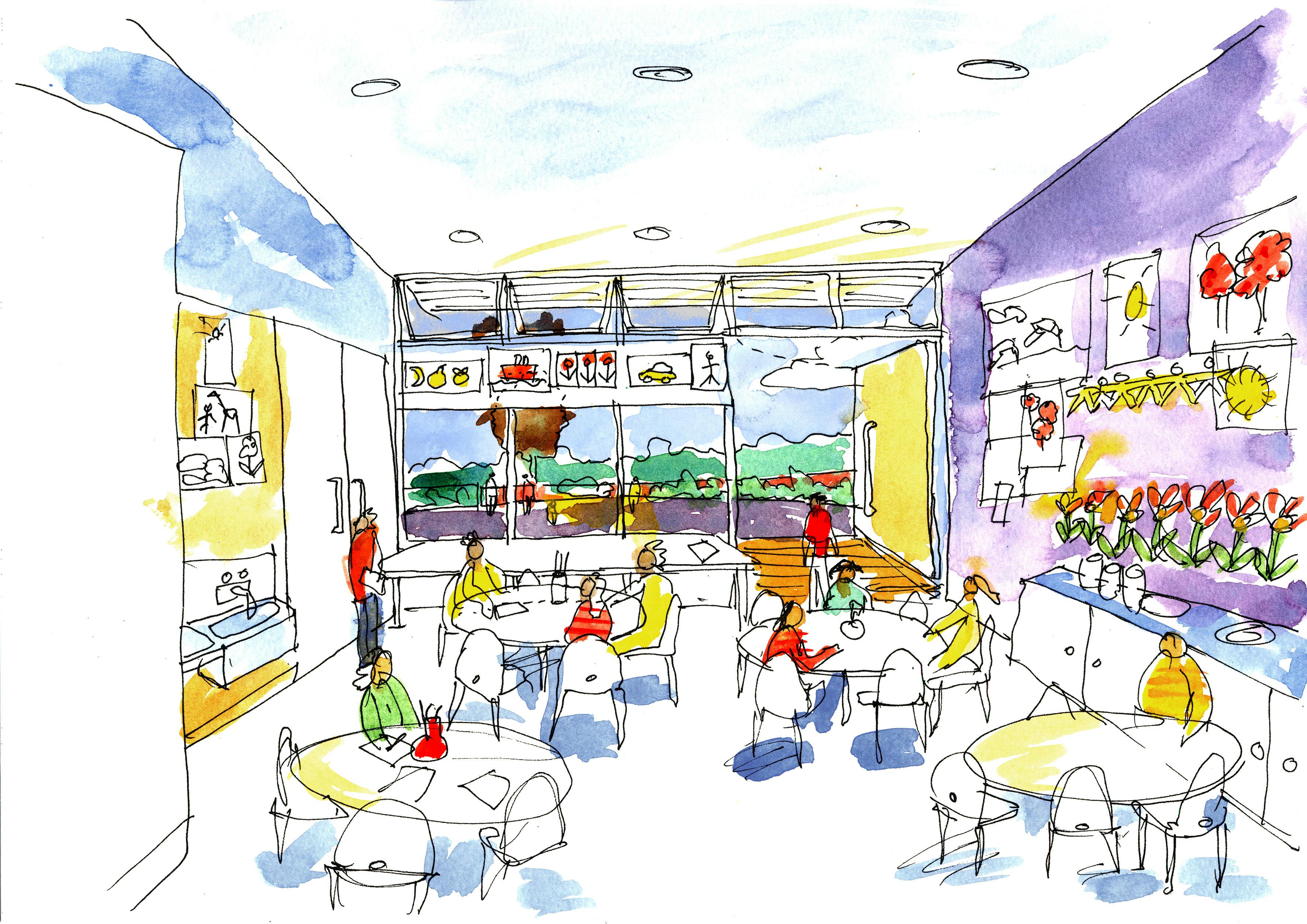 The school was nestled into the surrounding landscape, tucked into a slope to the north and discreetly sheltered behind a new earth bund to the south. The school was orientated to maximize natural ventilation and ensure even daylight levels throughout, as part of a passive environmental approach to achieve BREEAM Pre-assessment Excellent.